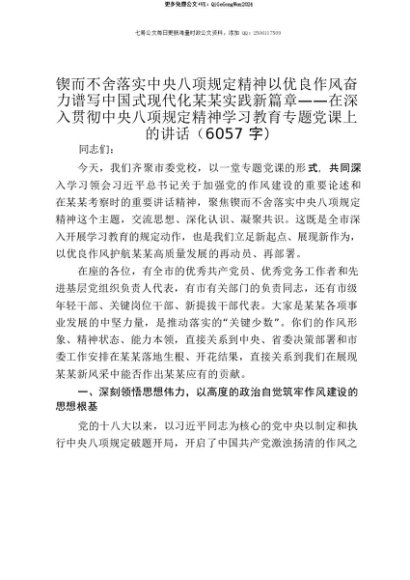 【七哥公文】2025年:【七哥公文】锲而不舍落实中央八项规定精神以优良作风奋力谱写中国式现代化某某实践新篇章——在深入贯彻中央八项规定精神学习教育专题党课上的讲话(6057字)+更多免费公文+VX:QiGeGongWen2024+更多免费公文+VX:QiGeGongWen2024