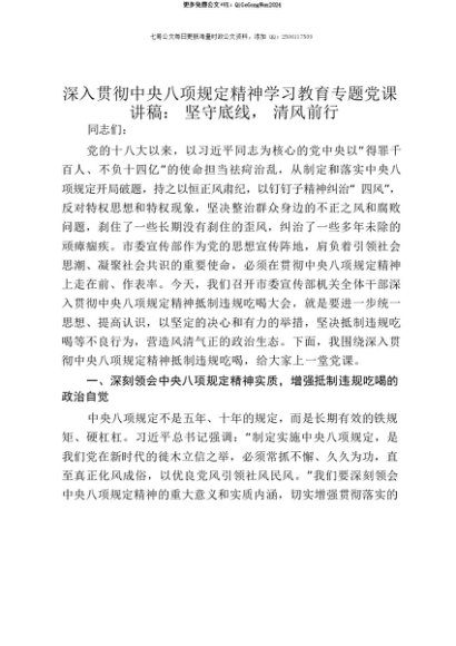 【七哥公文】2025年:【七哥公文】深入贯彻中央八项规定精神学习教育专题党课讲稿:坚守底线,清风前行+更多免费公文+VX:QiGeGongWen2024+更多免费公文+VX:QiGeGongWen2024