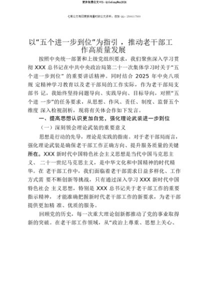 【七哥公文】2025年:【七哥公文】老干部局支部书记关于“五个进一步到位”的重要讲话精神学习研讨发言材料(学习第二十一次集体学习时讲话精神)+更多免费公文+VX:QiGeGongWen2024+更多免费公文+VX:QiGeGongWen2024
