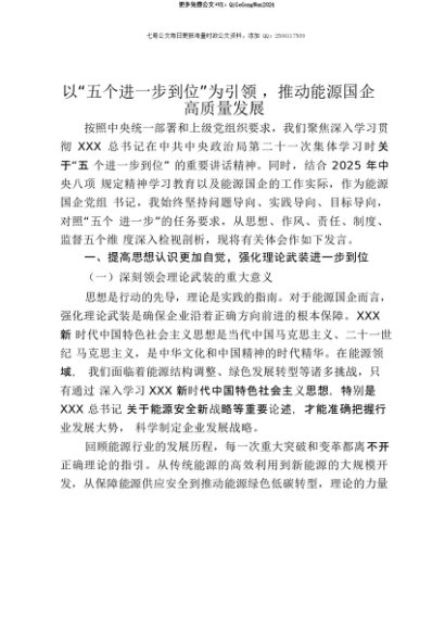 【七哥公文】2025年:【七哥公文】能源国企党组书记关于“五个进一步到位”的重要讲话精神学习研讨发言材料(学习第二十一次集体学习时讲话精神)+更多免费公文+VX:QiGeGongWen2024+更多免费公文+VX:QiGeGongWen2024