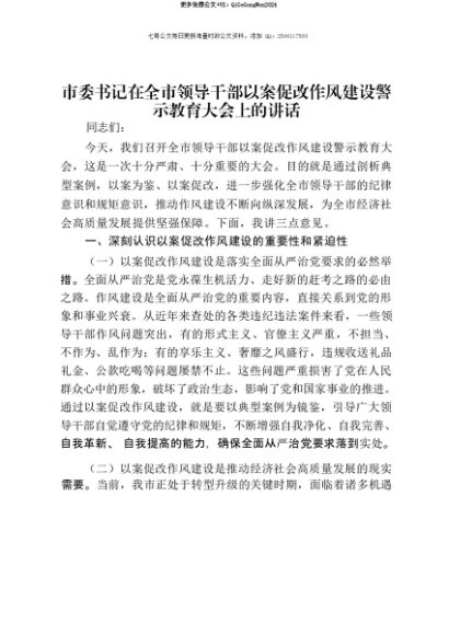【七哥公文】2025年:【七哥公文】市委书记在全市领导干部以案促改作风建设警示教育大会上的讲话+更多免费公文+VX:QiGeGongWen2024+更多免费公文+VX:QiGeGongWen2024