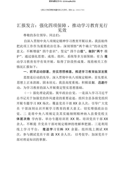 【七哥公文】2025年:【七哥公文】汇报发言:强化四项保障,推动学习教育见行见效(结合中央八项规定精神学习教育)+更多免费公文+VX:QiGeGongWen2024+更多免费公文+VX:QiGeGongWen2024