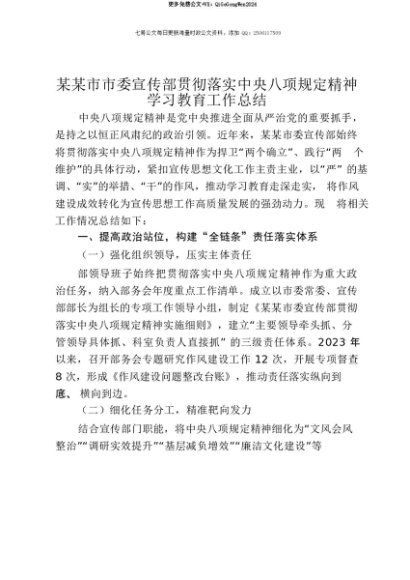 【七哥公文】2025年:【七哥公文】某某市市委宣传部贯彻落实中央八项规定精神学习教育工作总结+更多免费公文+VX:QiGeGongWen2024+更多免费公文+VX:QiGeGongWen2024