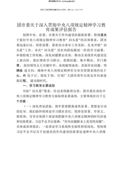 【七哥公文】2025年:【七哥公文】团市委关于深入贯彻中央八项规定精神学习教育成果评估报告+更多免费公文+VX:QiGeGongWen2024+更多免费公文+VX:QiGeGongWen2024