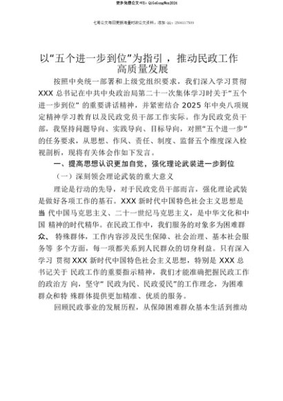 【七哥公文】2025年:【七哥公文】民政党员干部关于“五个进一步到位”的重要讲话精神学习研讨发言材料(学习第二十一次集体学习时讲话精神)+更多免费公文+VX:QiGeGongWen2024+更多免费公文+VX:QiGeGongWen2024