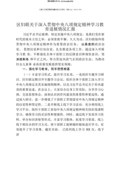 【七哥公文】2025年:【七哥公文】区妇联关于深入贯彻中央八项规定精神学习教育进展情况汇报+更多免费公文+VX:QiGeGongWen2024+更多免费公文+VX:QiGeGongWen2024