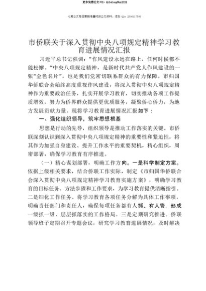 【七哥公文】2025年:【七哥公文】市侨联关于深入贯彻中央八项规定精神学习教育进展情况汇报+更多免费公文+VX:QiGeGongWen2024+更多免费公文+VX:QiGeGongWen2024
