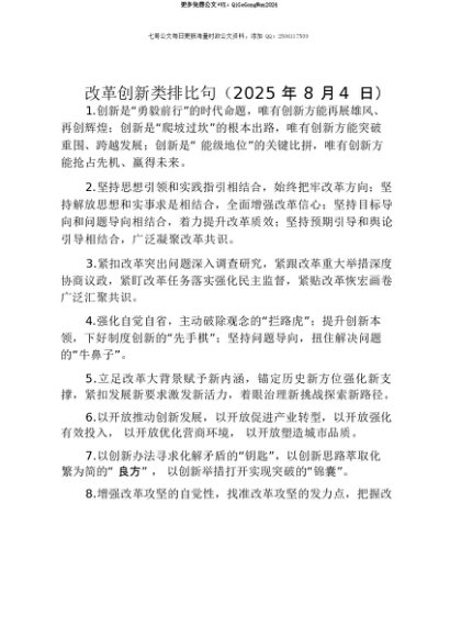 【七哥公文】2025年:【七哥公文】改革创新类排比句(2025年8月4日)+更多免费公文+VX:QiGeGongWen2024+更多免费公文+VX:QiGeGongWen2024