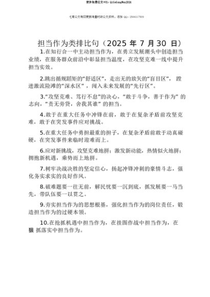 【七哥公文】2025年:【七哥公文】担当作为类排比句(2025年7月30日)+更多免费公文+VX:QiGeGongWen2024+更多免费公文+VX:QiGeGongWen2024