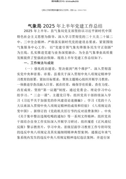 【七哥公文】2025年:【七哥公文】气象局2025年上半年党建工作总结+更多免费公文+VX:QiGeGongWen2024+更多免费公文+VX:QiGeGongWen2024