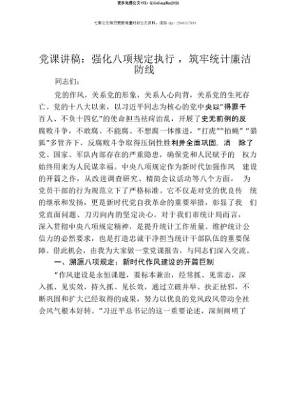 【七哥公文】2025年:【七哥公文】党课讲稿:强化八项规定执行,筑牢统计廉洁防线+更多免费公文+VX:QiGeGongWen2024+更多免费公文+VX:QiGeGongWen2024