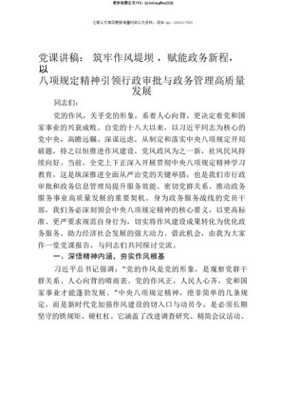 【七哥公文】2025年:【七哥公文】党课讲稿:筑牢作风堤坝,赋能政务新程,以八项规定精神引领行政审批与政务管理高质量发展+更多免费公文+VX:QiGeGongWen2024+更多免费公文+VX:QiGeGongWen2024