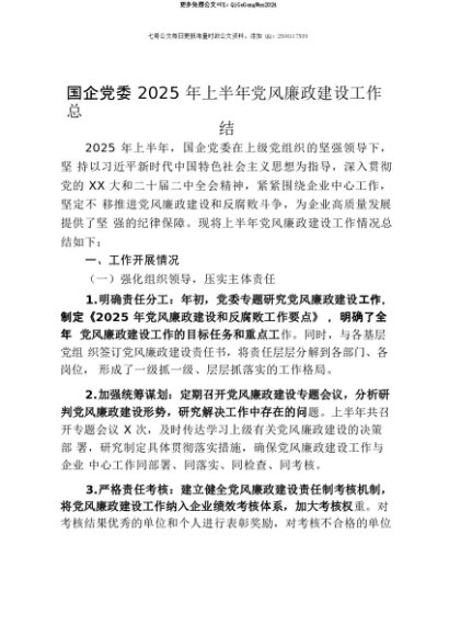 【七哥公文】2025年:【七哥公文】国企党委2025年上半年党风廉政建设工作总结(2)+更多免费公文+VX:QiGeGongWen2024+更多免费公文+VX:QiGeGongWen2024