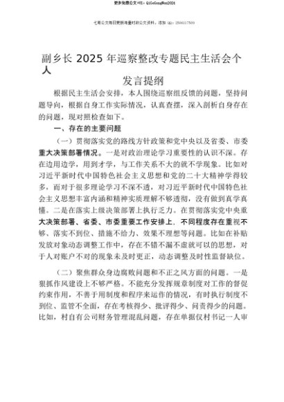 【七哥公文】2025年:【七哥公文】副乡长2025年巡察整改专题民主生活会个人发言提纲+更多免费公文+VX:QiGeGongWen2024+更多免费公文+VX:QiGeGongWen2024