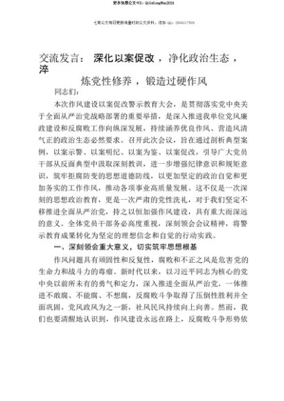 【七哥公文】2025年:【七哥公文】交流发言:深化以案促改,净化政治生态,淬炼党性修养,锻造过硬作风+更多免费公文+VX:QiGeGongWen2024+更多免费公文+VX:QiGeGongWen2024