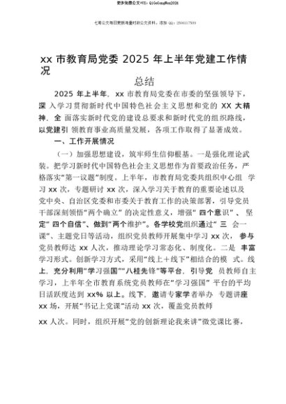 【七哥公文】2025年:【七哥公文】xx市教育局党委2025年上半年党建工作情况总结+更多免费公文+VX:QiGeGongWen2024+更多免费公文+VX:QiGeGongWen2024
