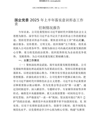 【七哥公文】2025年:【七哥公文】国企党委2025年上半年落实意识形态工作责任制情况报告+更多免费公文+VX:QiGeGongWen2024+更多免费公文+VX:QiGeGongWen2024