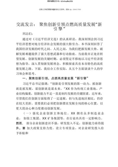 【七哥公文】2025年:【七哥公文】交流发言:聚焦创新引领 点燃高质量发展“新引擎”+更多免费公文+VX:QiGeGongWen2024+更多免费公文+VX:QiGeGongWen2024