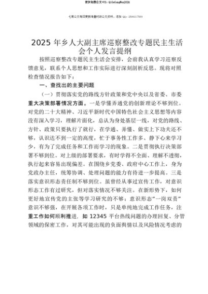 【七哥公文】2025年:【七哥公文】2025年乡人大副主席巡察整改专题民主生活会个人发言提纲+更多免费公文+VX:QiGeGongWen2024+更多免费公文+VX:QiGeGongWen2024