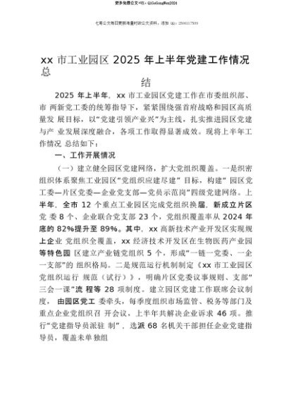 【七哥公文】2025年:【七哥公文】xx市工业园区2025年上半年党建工作情况总结+更多免费公文+VX:QiGeGongWen2024+更多免费公文+VX:QiGeGongWen2024