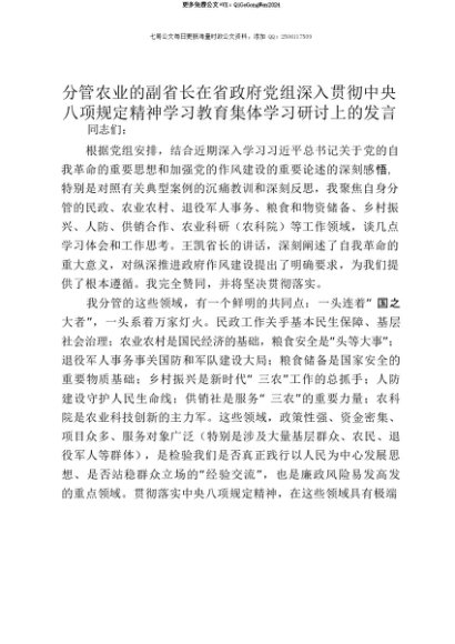 【七哥公文】2025年:【七哥公文】分管农业的副省长在省政府党组深入贯彻中央八项规定精神学习教育集体学习研讨上的发言+更多免费公文+VX:QiGeGongWen2024+更多免费公文+VX:QiGeGongWen2024