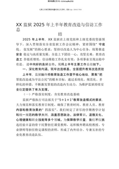 【七哥公文】2025年:【七哥公文】XX监狱2025年上半年教育改造与信访工作总结+更多免费公文+VX:QiGeGongWen2024+更多免费公文+VX:QiGeGongWen2024