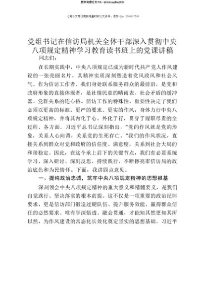 【七哥公文】2025年:【七哥公文】党组书记在信访局机关全体干部深入贯彻中央八项规定精神学习教育读书班上的党课讲稿+更多免费公文+VX:QiGeGongWen2024+更多免费公文+VX:QiGeGongWen2024