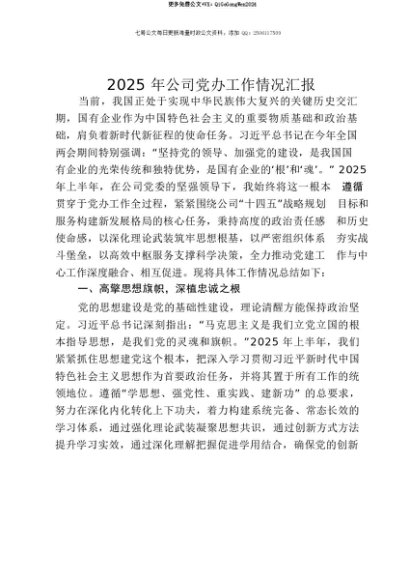 【七哥公文】2025年:【七哥公文】2025年公司党办工作情况汇报+更多免费公文+VX:QiGeGongWen2024+更多免费公文+VX:QiGeGongWen2024