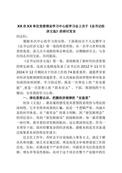 【七哥公文】2025年:XX在XX单位党委理论学习中心组学习会上关于《总书记经济文选》的研讨发言+更多免费公文+VX:QiGeGongWen2024