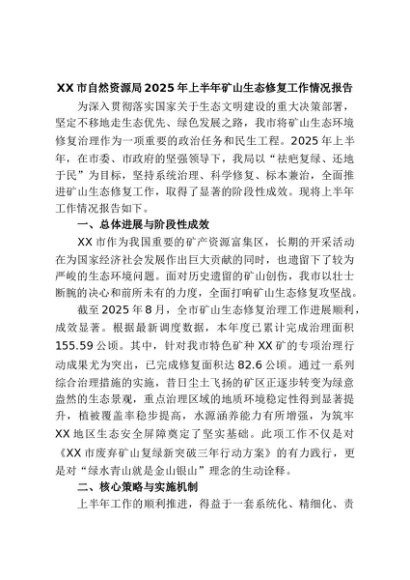 【七哥公文】2025年:XX市自然资源局2025年上半年矿山生态修复工作情况报告+更多免费公文+VX:QiGeGongWen2024