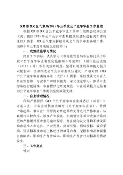 【七哥公文】2025年:XX市XX区气象局2025年三季度公平竞争审查工作总结+更多免费公文+VX:QiGeGongWen2024