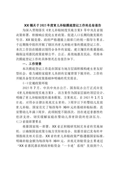 【七哥公文】2025年:XX镇关于2025年度育儿补贴摸底登记工作的总结报告+更多免费公文+VX:QiGeGongWen2024