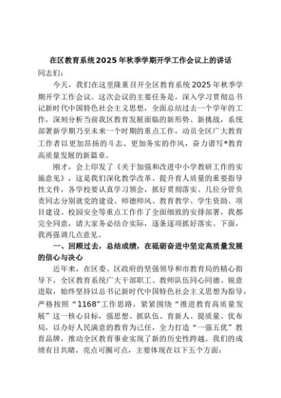 / 【七哥公文】2025年:在区教育系统2025年秋季学期开学工作会议上的讲话+更多免费公文+VX:QiGeGongWen2024