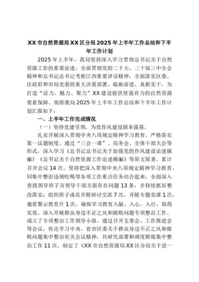 【七哥公文】2025年:XX市自然资源局XX区分局2025年上半年工作总结和下半年工作计划+更多免费公文+VX:QiGeGongWen2024