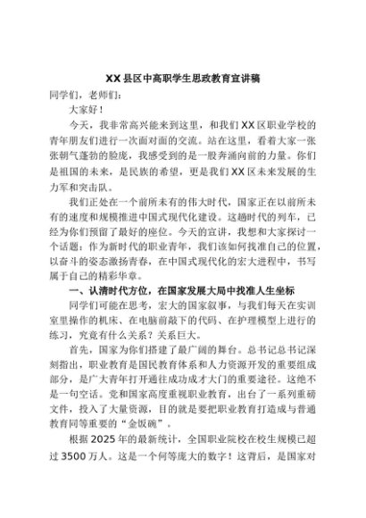 【七哥公文】2025年:XX县区中高职学生思政教育宣讲稿+更多免费公文+VX:QiGeGongWen2024