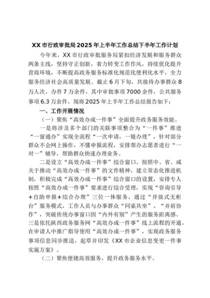 【七哥公文】2025年:XX市行政审批局2025年上半年工作总结下半年工作计划+更多免费公文+VX:QiGeGongWen2024