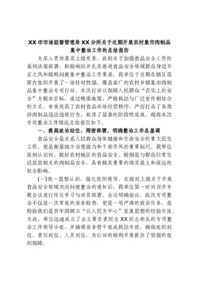 【七哥公文】2025年:XX市市场监督管理局XX分所关于近期开展农村集市肉制品集中整治工作的总结报告+更多免费公文+VX:QiGeGongWen2024
