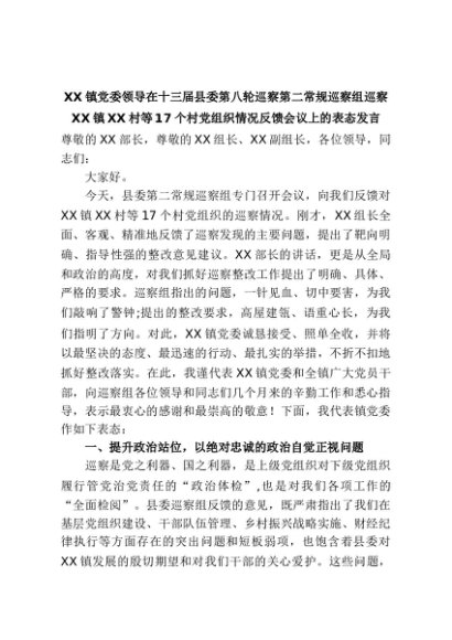 【七哥公文】2025年:XX镇党委领导在十三届县委第八轮巡察第二常规巡察组巡察XX镇XX村等17个村党组织情况反馈会议上的表态发言+更多免费公文+VX:QiGeGongWen2024