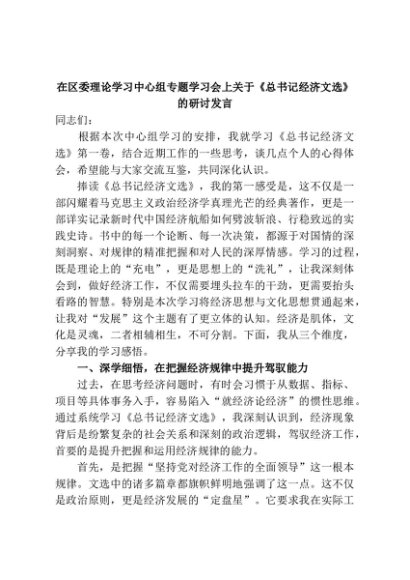 【七哥公文】2025年:在区委理论学习中心组专题学习会上关于《总书记经济文选》的研讨发言+更多免费公文+VX:QiGeGongWen2024