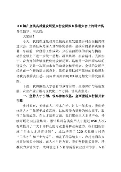 【七哥公文】2025年:XX镇在全镇高质量发展暨乡村全面振兴推进大会上的讲话稿+更多免费公文+VX:QiGeGongWen2024