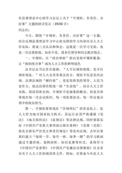 【七哥公文】2025年:在县委理论中心组学习会议上关于“守规矩、负责任、办好事”主题的研讨发言(3930字)+更多免费公文+VX:QiGeGongWen2024