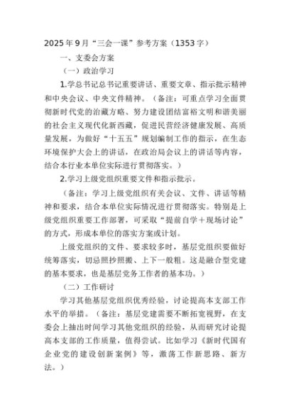 【七哥公文】2025年:2025年9月“三会一课”参考方案(1353字)+更多免费公文+VX:QiGeGongWen2024