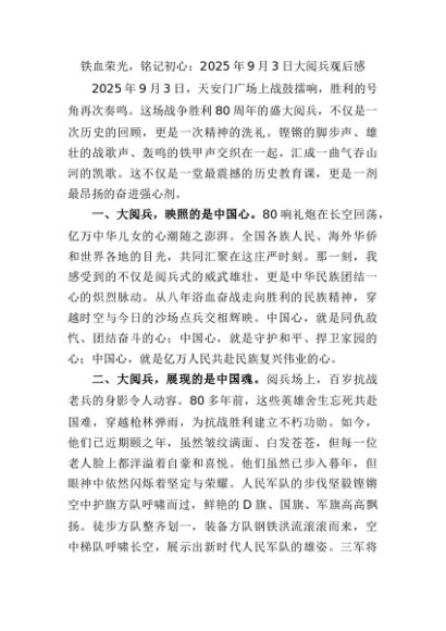 【七哥公文】2025年:铁血荣光,铭记初心:2025年9月3日大阅兵观后感+更多免费公文+VX:QiGeGongWen2024