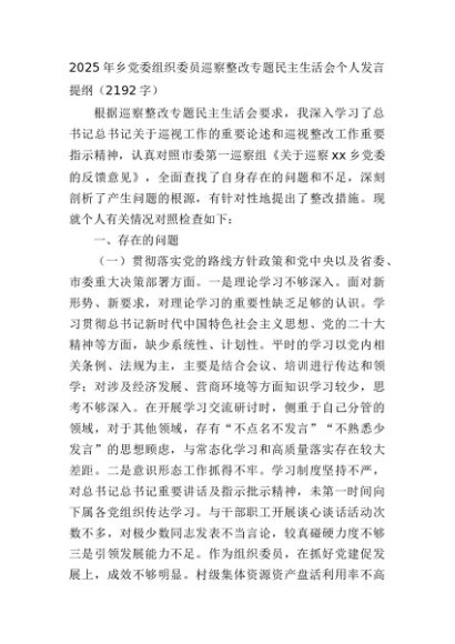 【七哥公文】2025年:2025年乡党委组织委员巡察整改专题民主生活会个人发言提纲(2192字)+更多免费公文+VX:QiGeGongWen2024