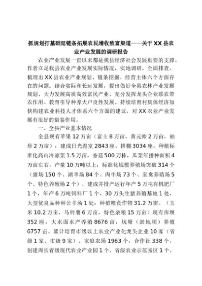 【七哥公文】2025年:抓规划打基础延链条 拓展农民增收致富渠道——关于XX县农业产业发展的调研报告+更多免费公文+VX:QiGeGongWen2024