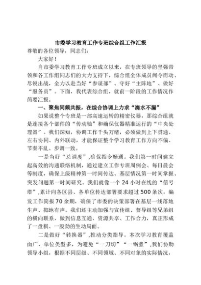 / 【七哥公文】2025年:市委学习教育工作专班综合组工作汇报+更多免费公文+VX:QiGeGongWen2024