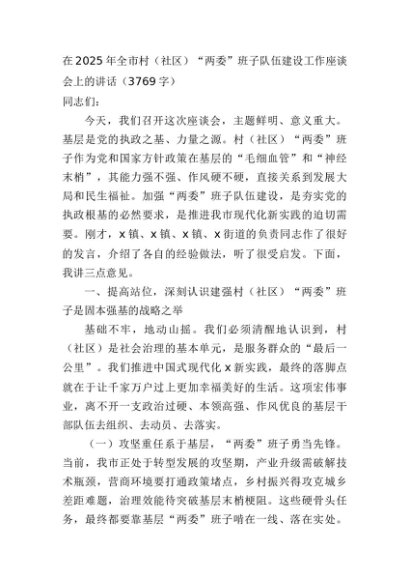 【七哥公文】2025年:在2025年全市村(社区)“两委”班子队伍建设工作座谈会上的讲话(3769字)+更多免费公文+VX:QiGeGongWen2024