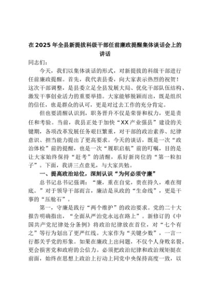 【七哥公文】2025年:在2025年全县新提拔科级干部任前廉政提醒集体谈话会上的讲话+更多免费公文+VX:QiGeGongWen2024