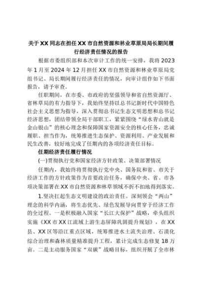 【七哥公文】2025年:关于XX同志在担任XX市自然资源和林业草原局局长期间履行经济责任情况的报告+更多免费公文+VX:QiGeGongWen2024