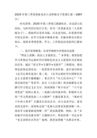 【七哥公文】2025年:2025年第三季度预备党员入党积极分子思想汇报(1897字)+更多免费公文+VX:QiGeGongWen2024